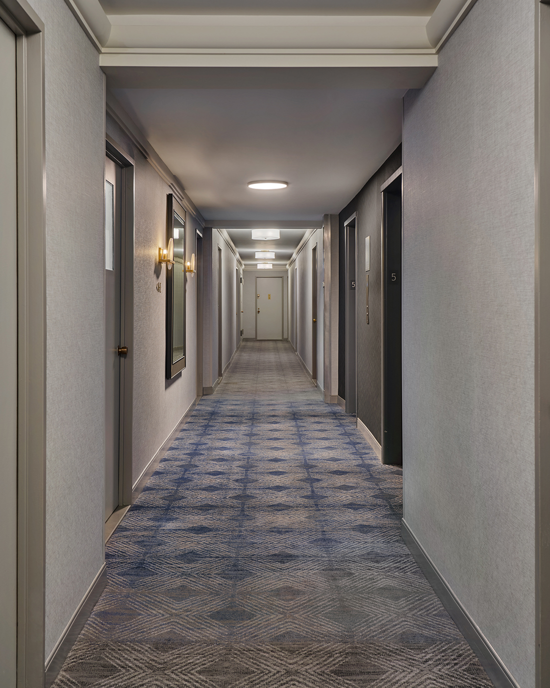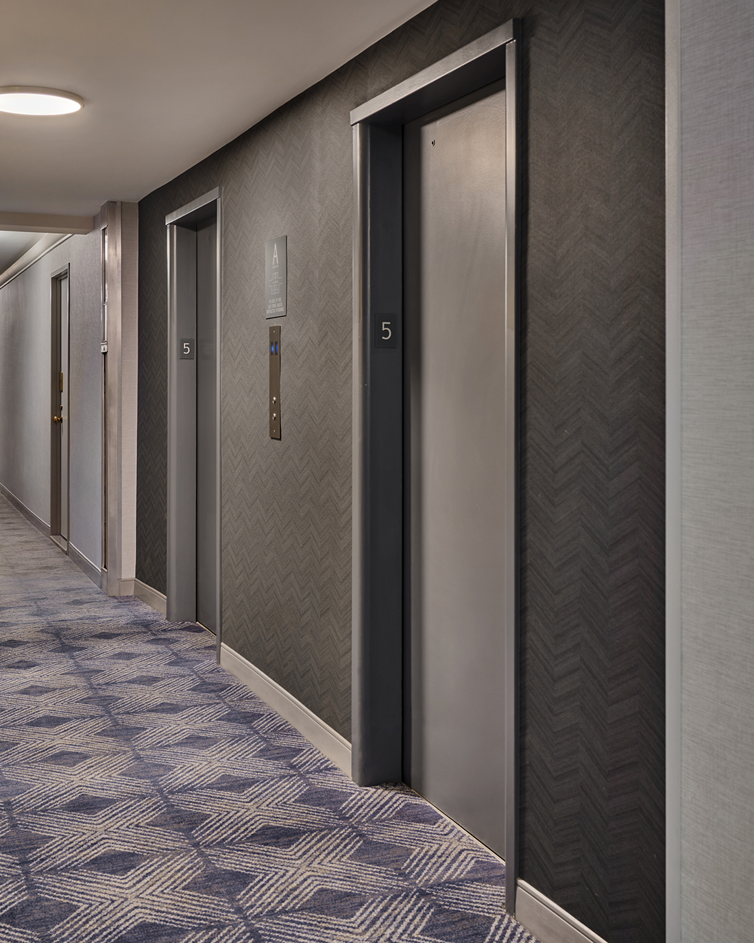 • Accent Wallcovering and Carpet Pattern featuring a vibrant blue draw attention to doors and the elevator landing.