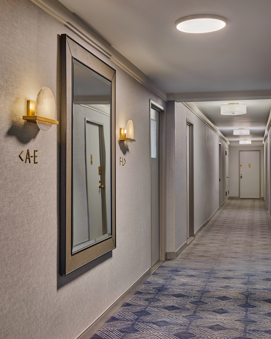 • An oversized mirror and flanking sconces at the elevator landing bounces light and color around the space