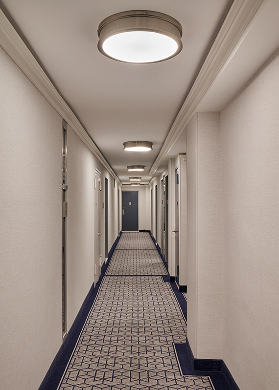 When ALine Studio begins any corridor design, we typically start with the carpet as the basis of the design. From there, the rest of the design elements are layered to create a cohesive look.